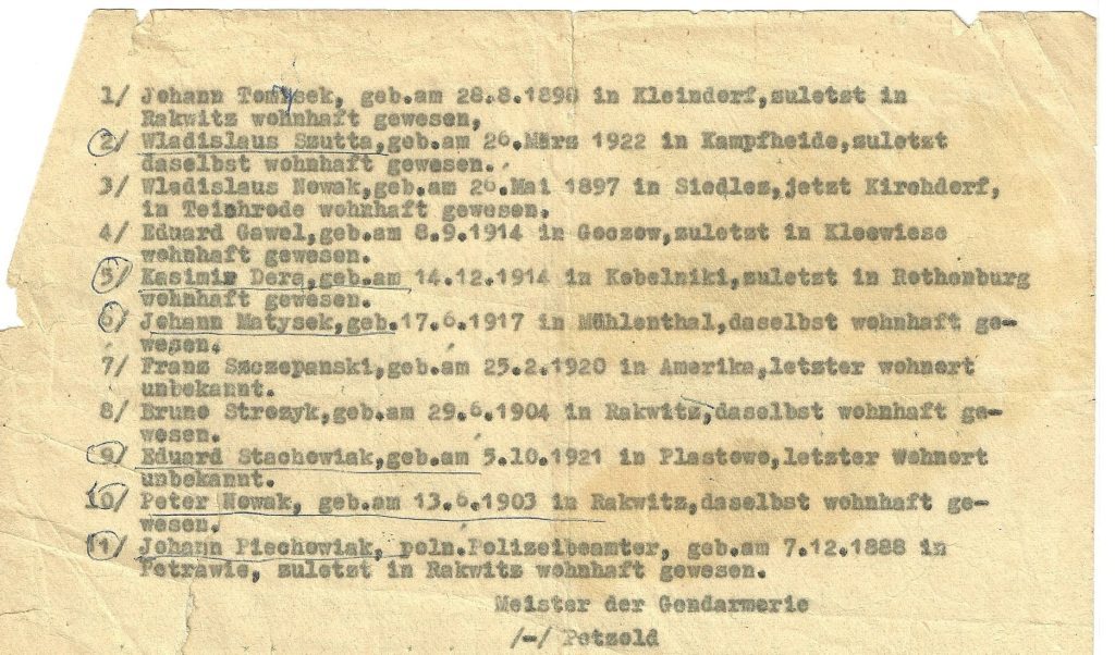 – Nowak Piotr, ur. 13.06.1903 r. z Rakoniewic (na wezwanie władz polskich internował Niemców na początku września 1939 r.)